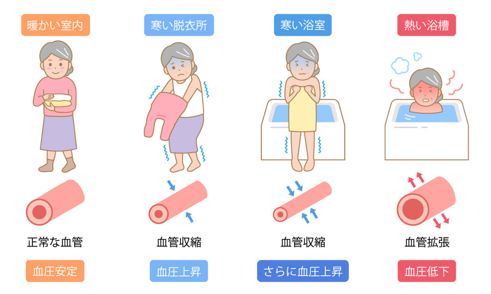 ヒートショックとは、急激な温度変化(寒暖差)によって血圧が急上昇・急降下することにより、血管や心臓に大きな負担がかかることを指します。