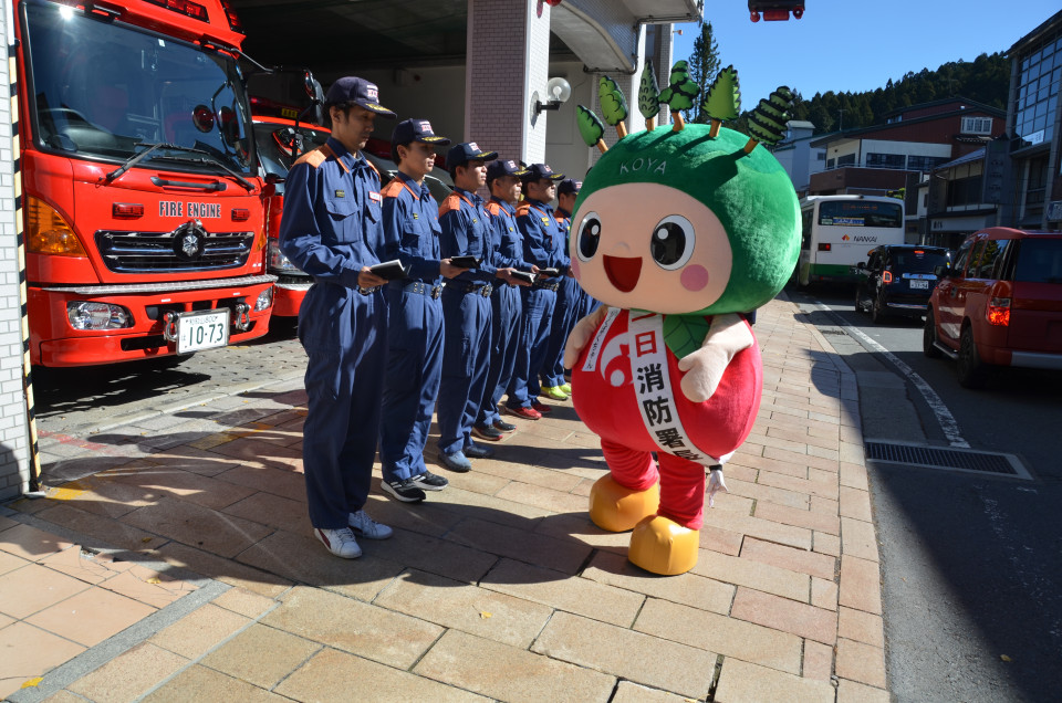 高野町マスコットキャラクター「りくぼくちゃん」を一日消防署長に任命し、金剛峯寺前での街頭防火啓発(雨天中止)、特別養護老人ホーム南山苑への防火訪問、高野山学びの杜見守り等を行います。