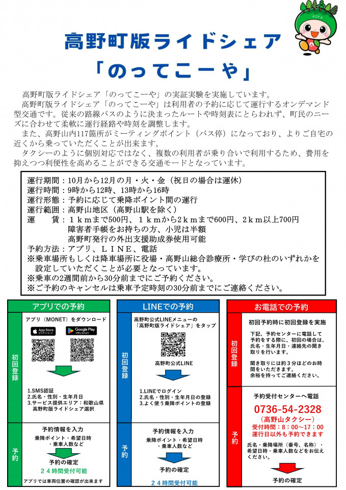 高野町版ライドシェア「のってこーや」実証実験について【町民限定】