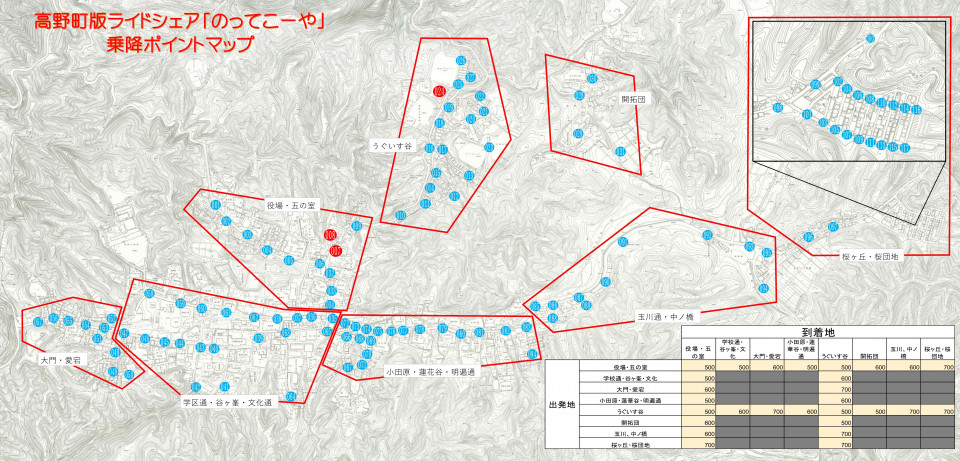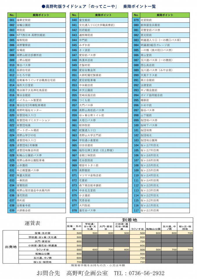 今回は、既存交通事業者への配慮として、高野山内限定、高野町民限定、乗降場所のどちらかに役場・診療所・学びの杜を設定していただくことを必須としています。